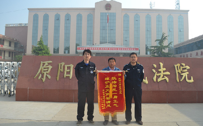 2016年4月21日上午,原阳县路寨乡许北村第六村民组组长张周代表该村民组,将一面绣有“执法为民一身正气,维护正义两袖清风”的锦旗送到执行二庭庭长李秀岭和执行员李鹏手中,对他们在办理案件中秉公执法、高效维权表示感谢。