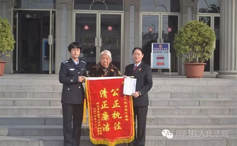 11月9日上午,家住封丘县居厢乡小沙村的七旬老太张美荣一大早来到原阳县法院,亲手将一面题为“公正执法 清正廉洁”的锦旗和一封感谢信送给我院行政庭叶维娜、王育敏两位干警。