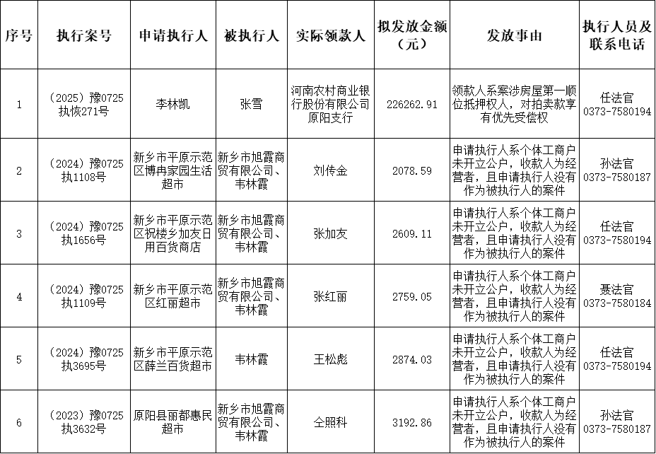 原阳县人民法院关于向案外人发放执行案款信息的公示(2025年第8期) 作者:关瑞红 发布时间:2025-09-01 15:22:13