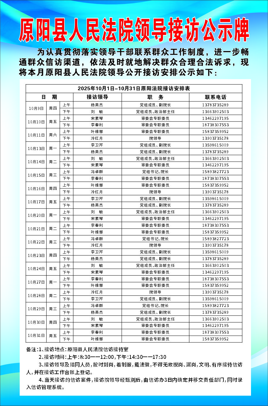 原阳县人民法院十月份领导接访公示