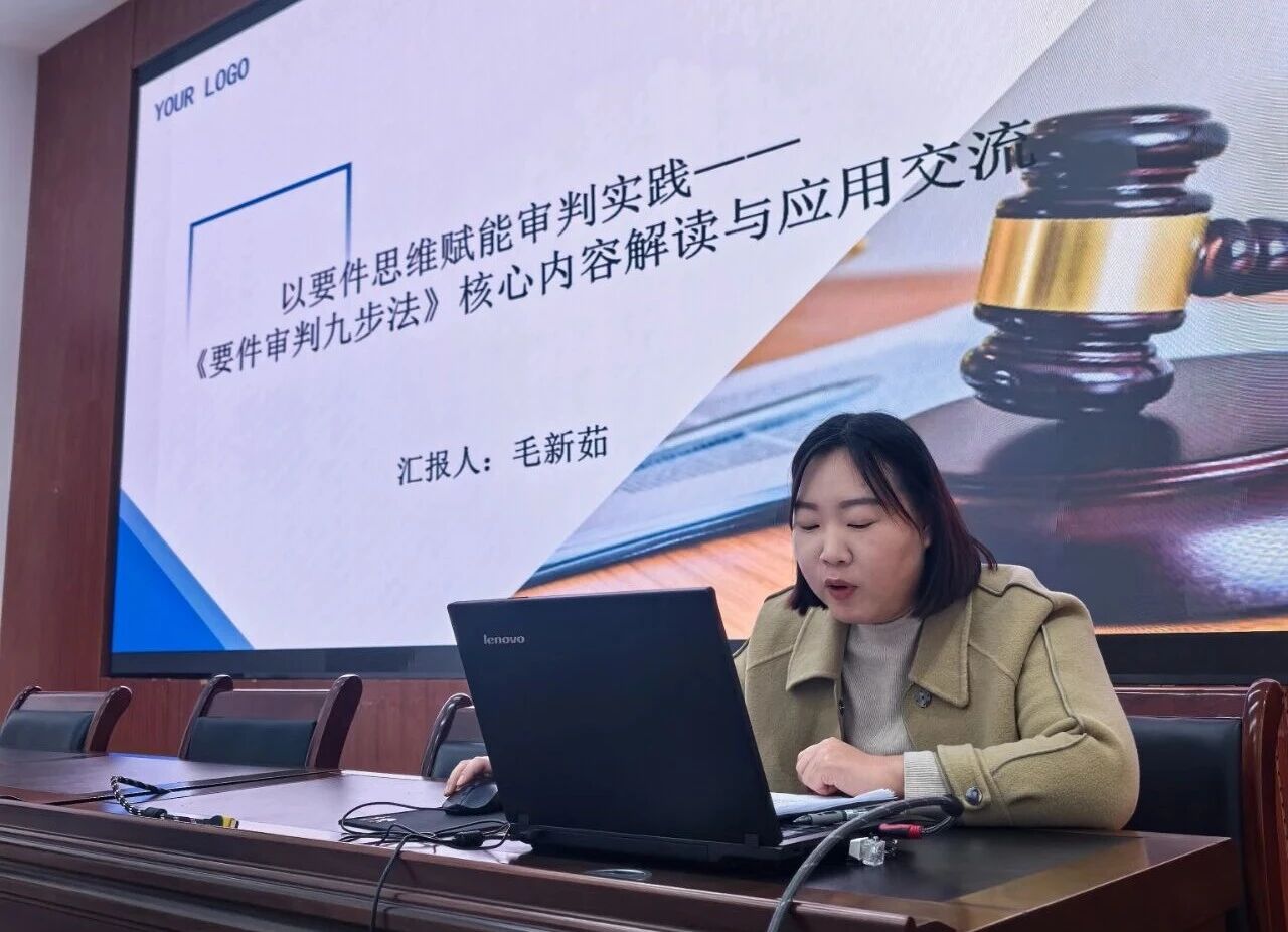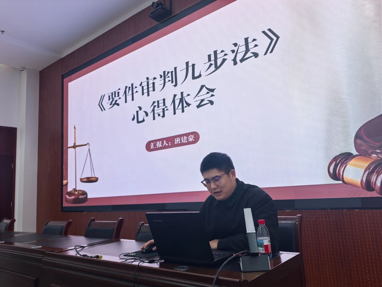 本期读书会由毛新茹法官担任主讲。她结合自身丰富的审判经验,通过典型实例剖析,系统梳理了《要件审判九步法》的整体框架与核心价值,重点解读了本书第一、二章节内容,围绕审判实践中如何精准识别请求权、把握审判关键环节等实务知识,进行了深入浅出的讲解,为青年干警提供了清晰的方法论指引。