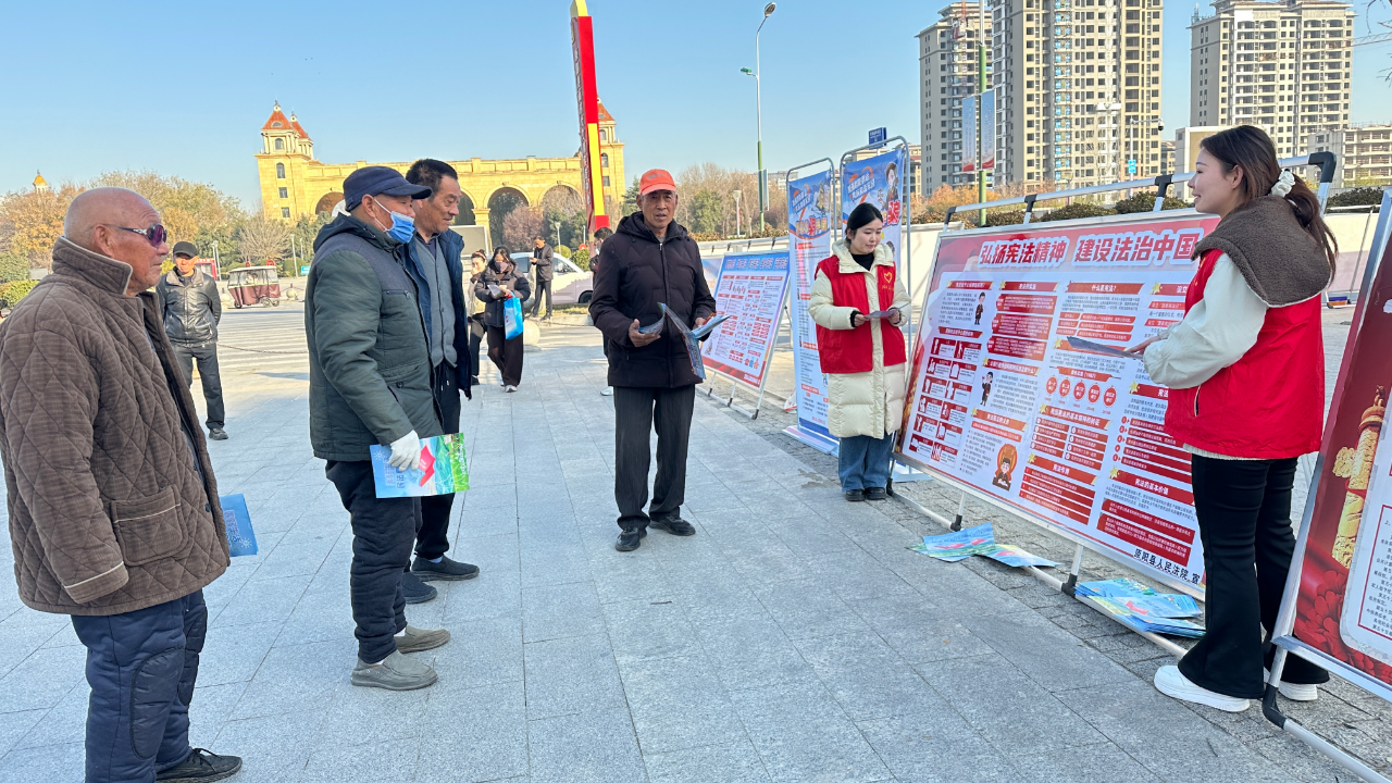 法院志愿者们来到县“四馆一中心”前的国家宪法日集中宣传点,与县普法成员单位携手开展宪法主题宣传。活动现场,干警们向群众发放宣传页等资料200余份,聚焦宪法核心知识与民生热点,用“家常话”讲解公民基本权利义务、婚姻家庭、财产继承、防诈骗等相关规定。针对群众提出的宅基地纠纷、权益维权等疑问,干警们以案释法、耐心答疑,现场回应咨询20余人次,让宪法精神从文本走向生活,切实引导群众树立“办事依法、遇事找法”的法治思维。